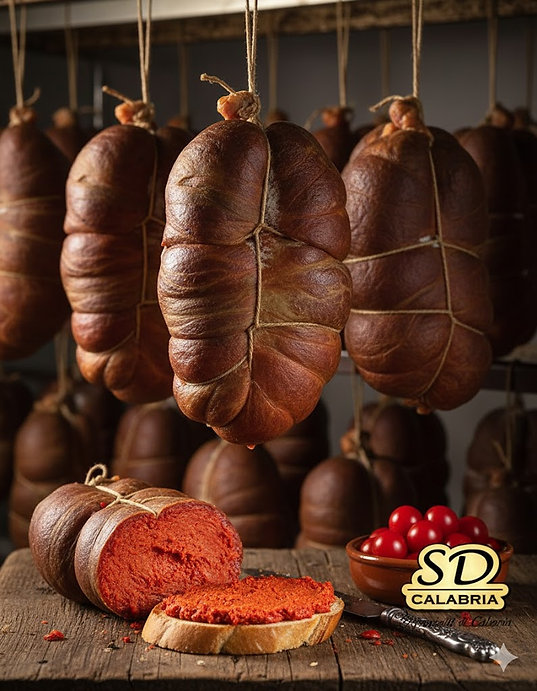 Ciò che la rende speciale è la consistenza: a differenza dei salami tradizionali, resta morbida grazie all’alto contenuto di grassi e alla macinatura fine. Il suo colore rosso intenso e l’aroma piccante derivano dall’**elevata quantità di peperoncini calabresi secchi**.
