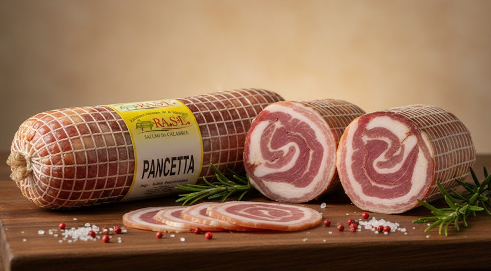 La carne di maiale viene accuratamente salata e arricchita con pepe nero e semi di finocchio aromatici, che conferiscono alla pancetta la sua tipica nota italiana leggermente aromatica.